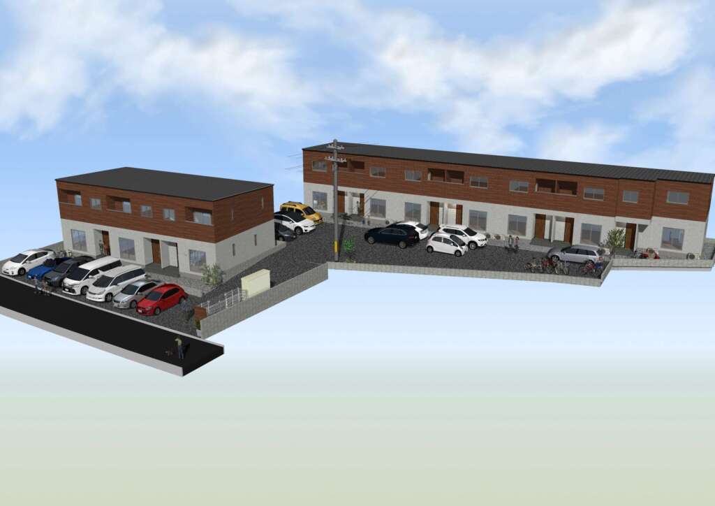 完成イメージパースです。駐車場も10世帯に対し15台とゆったりのスペースとなっています。