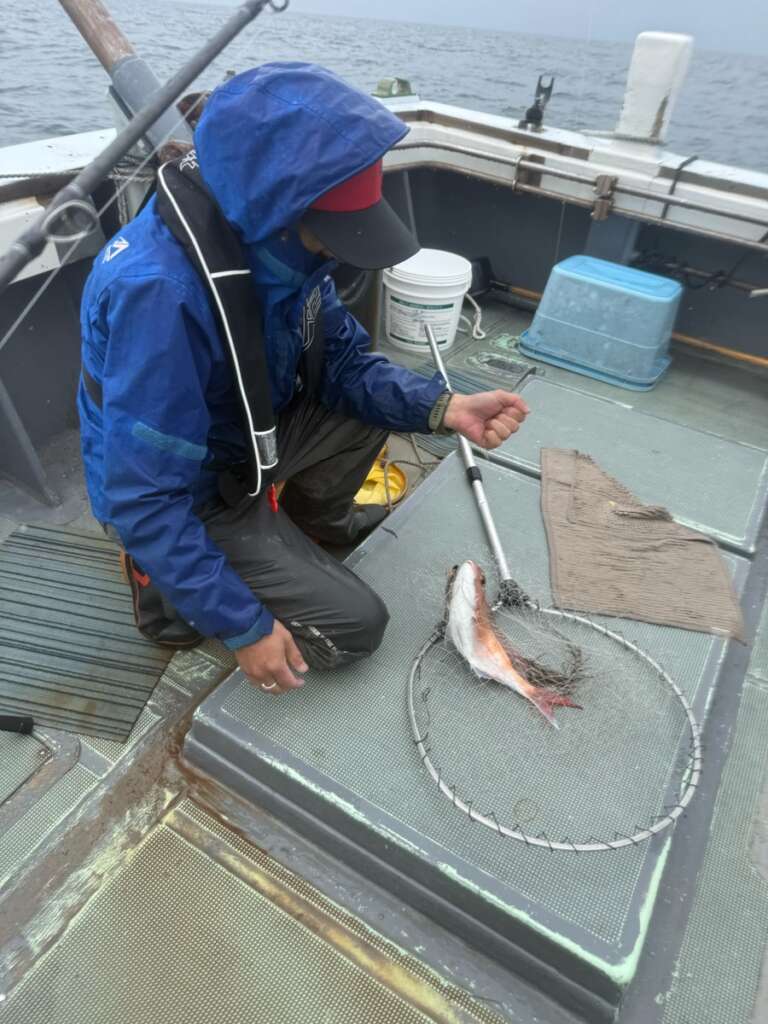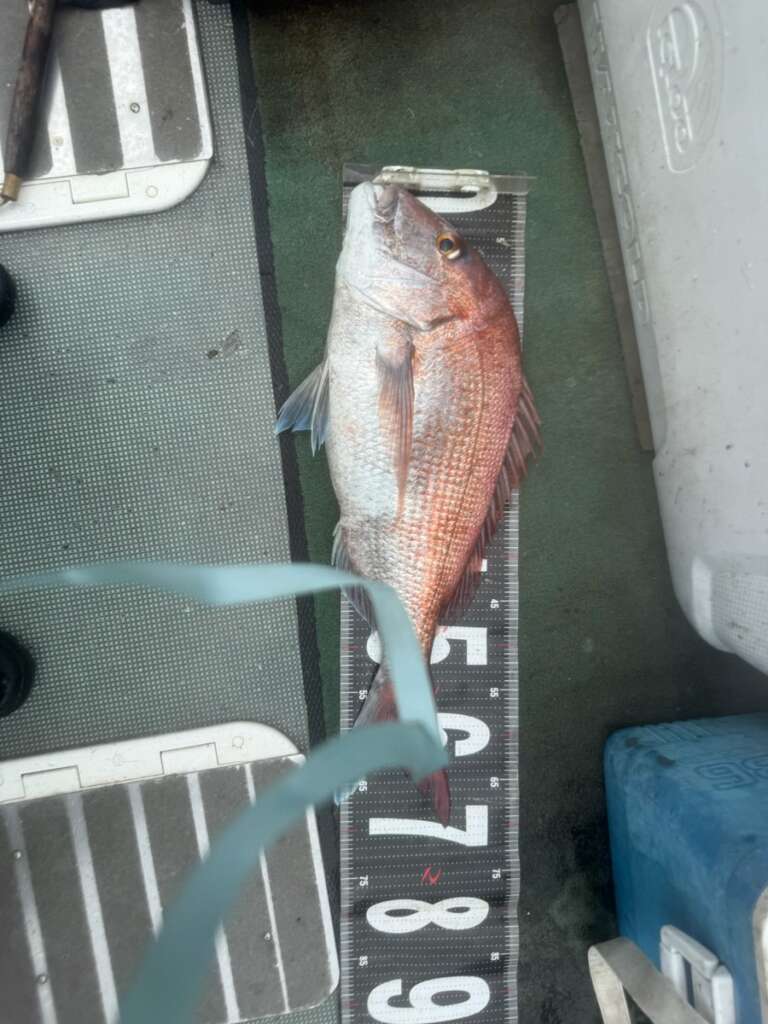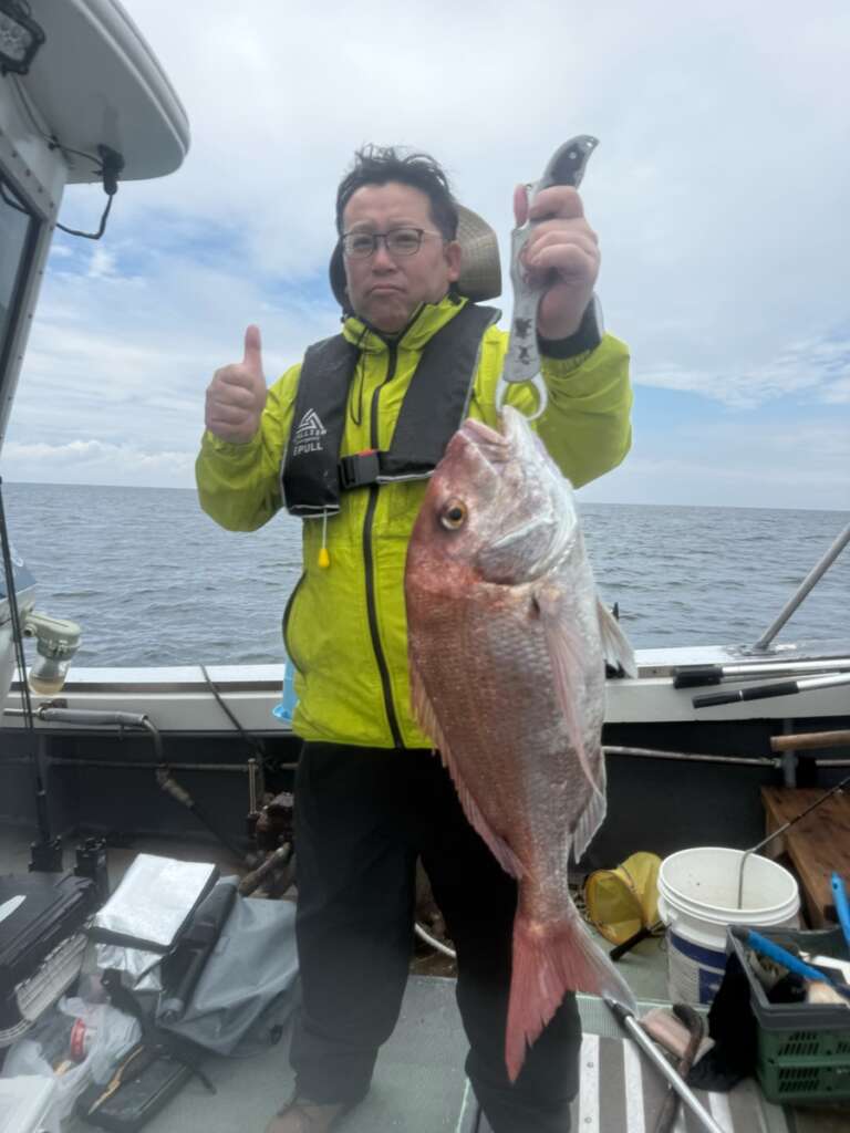 なんと!今回初参加で前の晩に道具をそろえた広告代理店のMさんに大鯛が釣れ大盛り上がりです!!